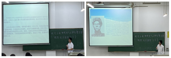 宁伟强、袁钦辉、邢日正、陈德立、廖伟杰五名同学上台分享作为学生代表上台讲述“抗美援朝“战局,让大家了解历史背景、战争过程、以及伤亡情况;介绍抗美援朝英勇献身的英雄:黄继光、邱少云、杨育才、罗盛教等英雄人物及其先锋事迹,伟大的抗美援朝精神永远是中国人民的宝贵财富,每个中国人都可以从中汲取勇气和力量。