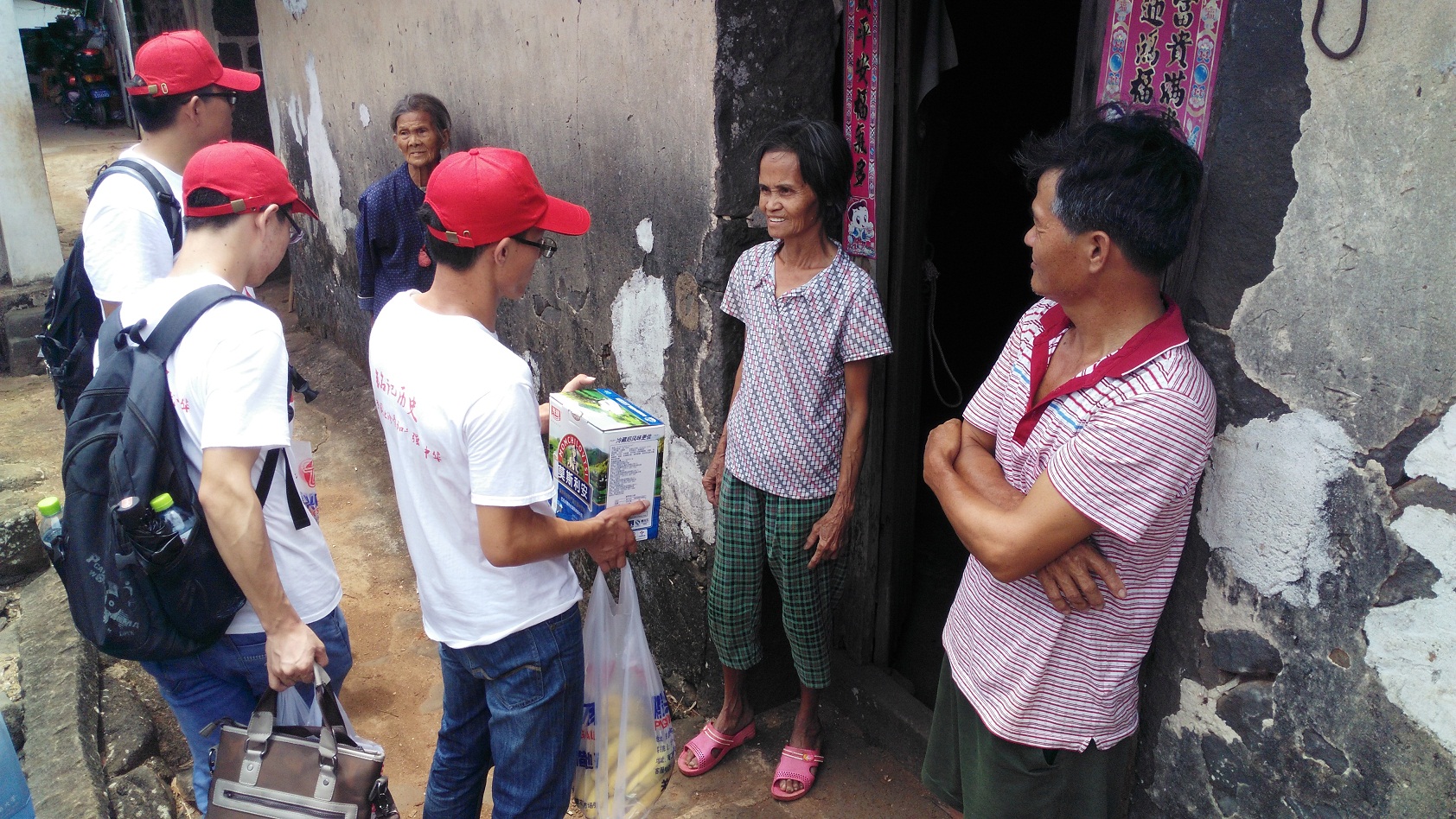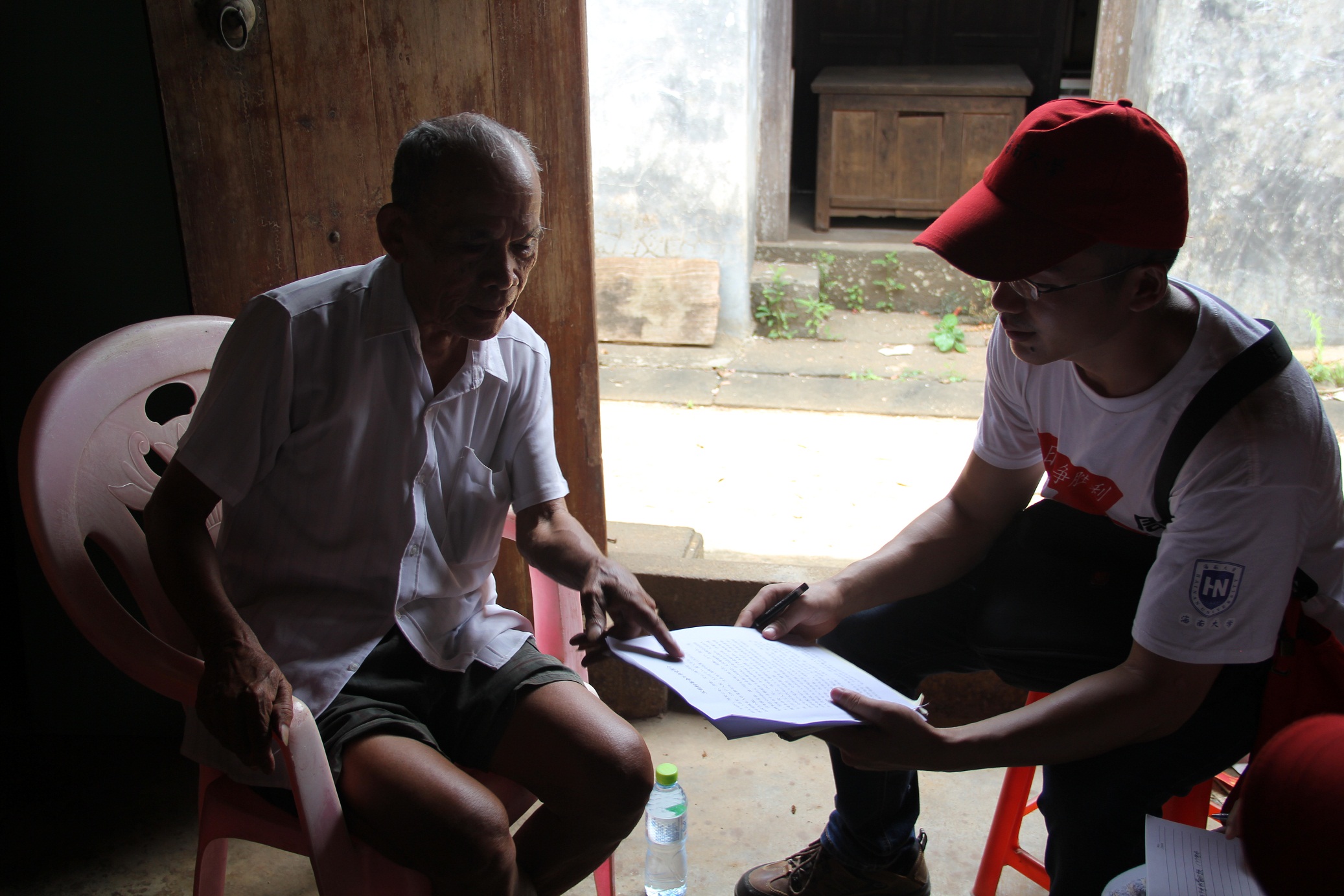 玉仙村,地处云龙、龙塘、灵山三镇交界处,南渡江畔,距潭口码头七八百米,275户人家,人口近千人,是人多地少的村庄。寻访团到达玉仙村村口后,由事先联系好的周队长(玉仙村第一组队长)带领一行人走进玉仙村。由周队长带领一行人对抗战老兵以及烈士家属进行访谈,据周队长介绍,玉仙村有10人被政府追认为烈士。寻访团第一位采访的对象是冼因明老先生,冼老先生是当年玉仙村地区的儿童团主要成员之一,据描述,当年白天由儿童团放哨,晚上由青年放哨。就在大榕树下,冼老先生为前来的寻访团讲述了当年潭口革命斗争史,极为生动的描述当年潭口渡口打响第一枪的场景。紧接着,冼老先生用亲眼目睹的事件揭露了日本侵略者的残酷之行,让在场寻访团为之而气愤不已!访谈结束之际,寻访团为冼老先生送上本次活动纪念品。随后,寻访团进行相应的分组,深入玉仙村,寻访抗战老兵以及烈士家属。