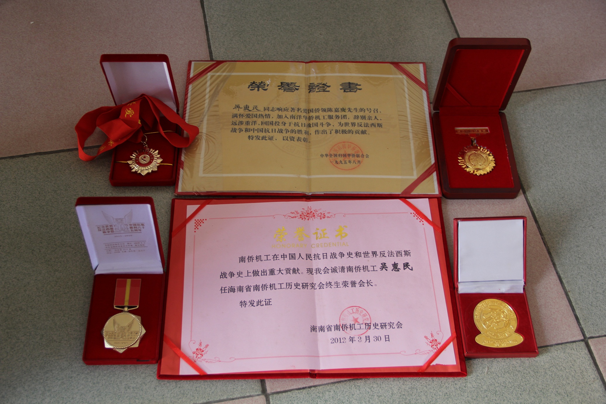 在琼海市委宣传部、民政局的帮助下,寻访团两组成员分别赴中原镇、万泉镇及塔洋镇寻访抗战老兵。采访中给我们留下深刻印象的是苏英銮老战士,她年事已高,行动不便,只能卧床与我们交谈。回忆在极其艰苦的抗战条件下,不断学习先进思想武装头脑,并带动身边的群众加入抗战队伍。在参加琼崖纵队先锋队时,在家乡琼东做通讯员,一次执行任务过程中,遭遇敌人的阻击身中两枪,倒在荆棘丛中满身刺伤,昏迷两天两夜才苏醒过来,被路过的村民及时发现,才得以幸存。最后,她拿出抗战时期的纪念品和一枚个人勋章与我们分享,它们见证和记录着当年那段艰难岁月中的光荣事迹,诉说着抗战时期与战友们的点点滴滴。随后,寻访团来到中原镇,采访吴惠民老战士。他1934年渡洋谋生,到新加坡半工半读。1937年七七事变,日本发动了大规模侵华战争,年仅十几岁的他深知天下兴亡,匹夫有责,毅然决然回国参加抗敌后援会、筹款总会及海南人组织的琼崖励志社等救国团体,每逢节假日都参加卖花筹款。1939年考入重庆黄埔军校,经过三年的刻苦训练,从少尉班长升任四十九师上尉连长,后调任降伞大队第八中队上尉分队长。1945年6月参加了广西丹竹机场的降落作战,占领丹竹机场消灭了数百名的日本鬼子。此外,寻访团对蔡淑蓉、刘国球、符树能、曹靖等4名抗战老兵进行了采访,他们都用自己受日本鬼子残酷迫害的血泪史控诉日本侵略者,希望能唤起国人的愤怒。