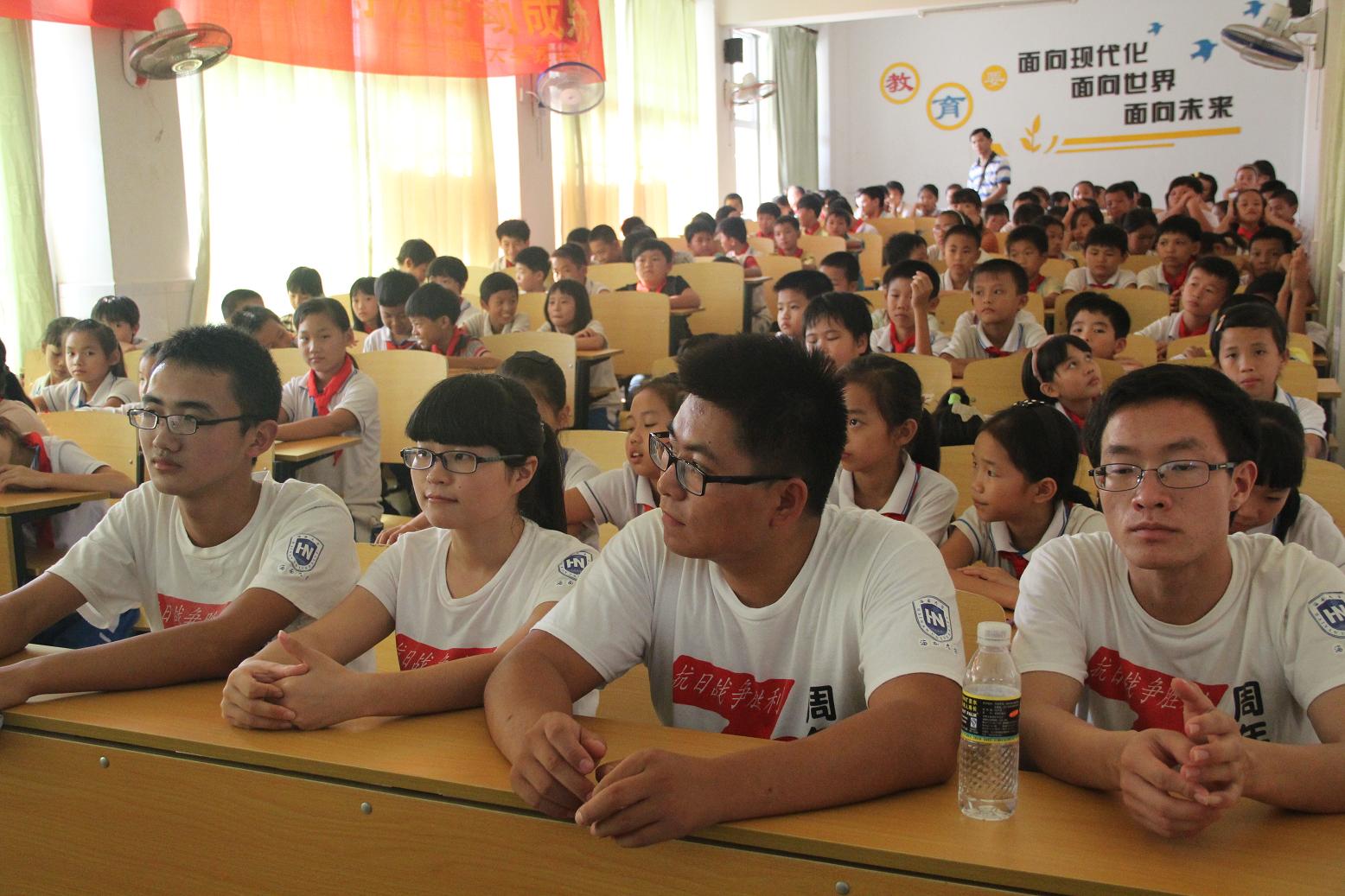 下午两点三十分,团队成员准时到达云龙中心小学,在该校韦副校长的帮助下,参加活动的100多位同学有序地进入会场就坐后,活动顺利开始。活动开始前,团队成员为同学们播放了前期制作的视频《全国大学生纪念抗战胜利70周年寻访活动》,视频具体围绕抗战胜利七十周年展开,逐步将主题引入抗战时期的海南战场,进而引出本次宣讲活动的主题——“铭记历史、圆梦中华”,视频结束后,团队代表团队代表朱凯峰、起家林等六名同学分别就本次暑期社会实践活动中印象最深的一位抗战老兵的故事与同学们一起交流,团队成员以生动的言语,将张云逸大将、远征军云昌舜等人的抗战光荣事迹讲给同学们听,使同学们对抗战有了更加深刻的记忆与体会。