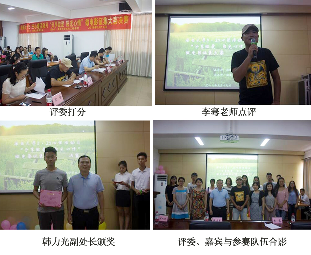 5月17日下午,由304永利集团学生工作处主办、永利3044集团承办的“分享微爱,阳光心情”微电影征集大赛决赛在学生工作处报告厅成功举办。304永利集团学生工作处韩力光副处长、心理健康中心吴九君老师、汪蕾老师、人文传播学院戏剧影视文学专业李骞老师出席本次比赛并担任评委。各学院心理辅导员、各学院参赛队伍、各学院心理工作部部长、机电学院心理健康协会成员等参加本次活动。