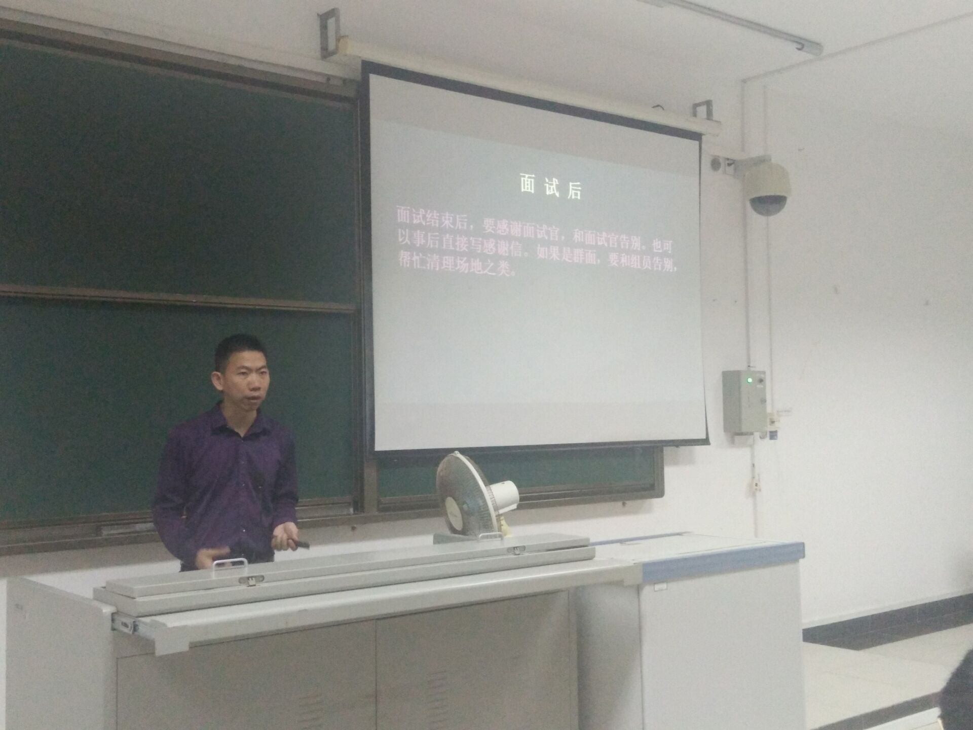 讲座上,杨志浩老师与同学们进行互动,邀请了同学上台做自我介绍,并以此为例,详细讲解了面试中做重要的环节——自我介绍。杨老师讲到,自我介绍应当以最基本的个人信息为前提,必须说清楚自己能胜任所应聘工作岗位的理由,还可以突出自己的特色,比如使用全英文自我介绍等。除此之外,杨老师也对面试前的准备及面试中的一些加分环节做了简单介绍。