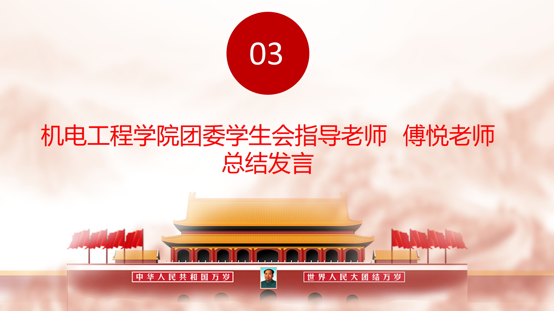活动的最后,机电团委学生会的指导老师傅悦老师做了总结讲话。她表以抗日战争、朝鲜战争中为国捐躯的青年,以及上世纪60年代在戈壁滩为祖国研究两弹一星的党员青年为例,希望当代青年能够学习榜样的力量,能够在国家需要的时候站出来,成为国家的脊梁。她希望我们机电的学子们能够了解这个世界,认识中国所处的位置,在中华民族艰苦奋斗过程体会中华民族的伟大与美好。最后,傅悦老师祝愿永利3044集团的学生们五四青年节快乐,并表达了希望我们向上想好,为中华民族伟大复兴的中国梦而努力奋斗。