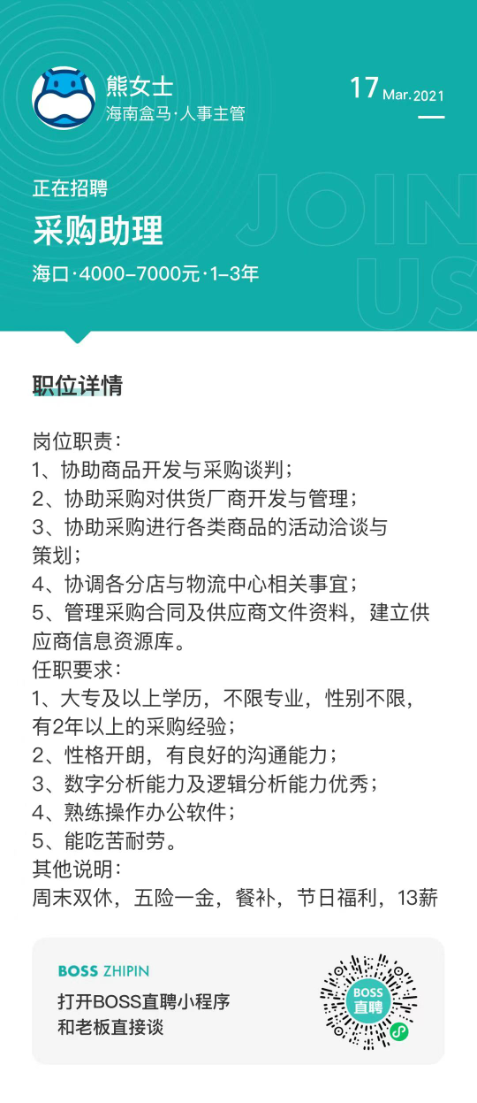 HRBP人力资源经理海口·7000-12000元·13月·5-10年