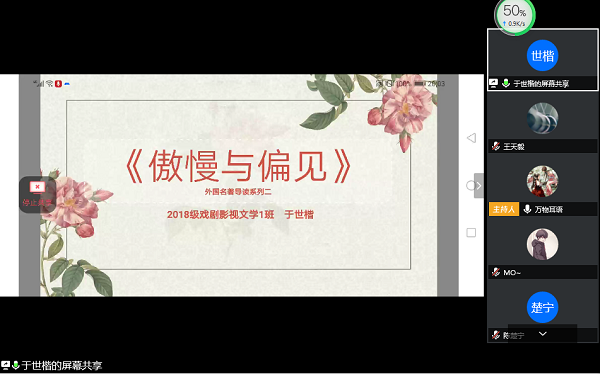 来自人文传播学院的于世楷同学向大家分享了英国现实主义文学作家简·奥斯汀的代表作《傲慢与偏见》。他简要介绍了作者并讲述了故事背景及故事梗概,通过对故事情节的分析,向大家分享了他对两位主人公的思考,字字珠玑,引得同学们在评论区发出阵阵赞许。他分享了自己的阅读感想,带领同学们一起走近那个时代的英国乡镇社会,就像《傲慢与偏见》向我们所传达的那样,第一印象并非一定是真实的,只有更加深入的了解,才能更客观认清彼此。待人待事,都是如此。