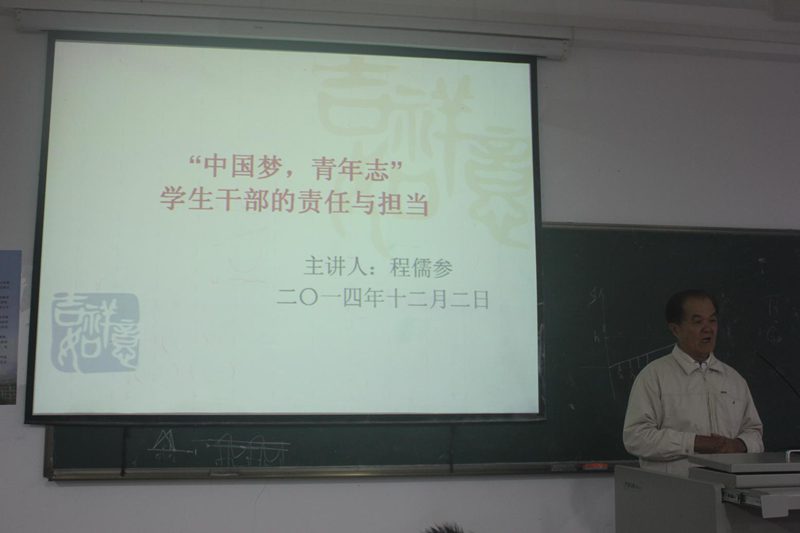 程儒参同志首先对同学们的热烈欢迎表示感谢。他说,学生干部作为教师与学生的桥梁具有双重属性,既是学院老师的好帮手,又是学生中的骨干、标杆、楷模与精英,这双重身份就决定了付出的同时也会有收获。学生干部在此锻炼平台上收获的组织协调、沟通表达等能力在跨入社会的第一步将会有明显优势。针对好干部的培养问题,他从以下五个方面给出建议:一是崇德修身。做人为先,立德为本;与人为善,助人为乐。正如古语所云:“修身,齐家,治国,平天下”,要时刻保持谦卑,注重自身德行品质;二是关心政治。思维与国民利益紧密联系,与党中央保持一致,避免偏激,在突发事件中免于立场上倾斜犯错的问题。三是起带头羊作用。适当为自己加压,利益之前带头谦让;四是讲究工作方法。抓重点,效率办事,如在语言表达上要精炼而不乏幽默,主要从做什么、为什么和怎么做三方面进行表达;五是正确处理学习与工作的关系。“非学不以广才,非志不以成学”,始终以学业为首,在此基础上处理工作事宜。他还强调了创新意识在现今结构调整、观念转变的背景下成为德才兼备之才的重要性。