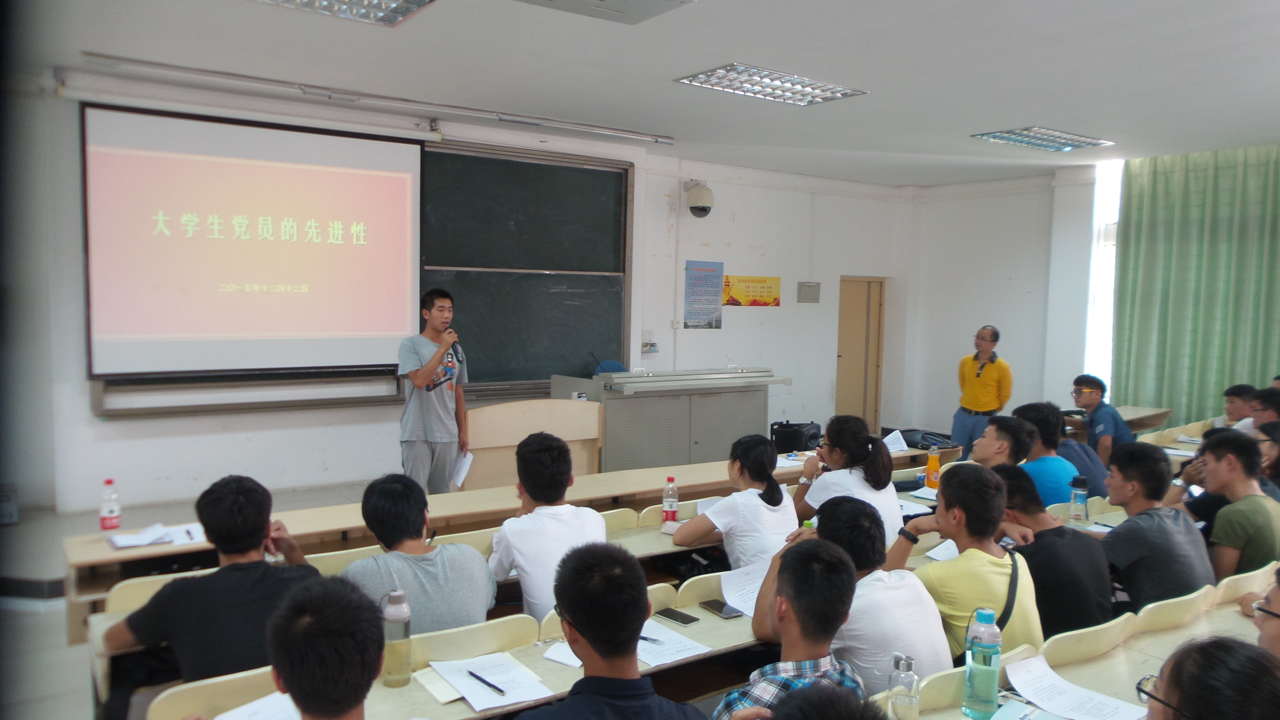 培训班第一讲邀请学校组织部副部长杨智平老师作《党章解读》讲解,针对党章的历史发展、形式地位、内容形式作了解读;第二讲由李宏副书记作《大学生党员先进性》讲解,李宏副书记寓教于乐、寓学于情,通过现场问卷、现场演讲、交流互动等形式与学员共同探讨党员先进性的问题;第三讲由致远传承宣讲团的同学们进行宣讲,宣讲日恰逢国家公祭日,宣讲前首先进行了集体默哀仪式,接下来的宣讲围绕抗战七十周年、南京大屠杀等历史活动展开;第四讲由学院黄国标书记作《端正动机入党光荣》讲座,黄书记通过讲解党的光辉历史、科学理论、标准要求帮助学员树立正确的入党动机和党的认识,鼓励大家争取早日达到一名共产党员的标准。