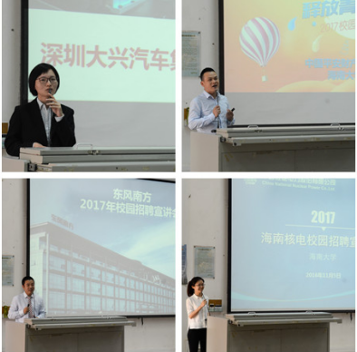中国平安财产保险股份有限公司、泰豪科技股份有限公司、海南核电有限公司等8家企业分别就公司概况、企业文化及招聘简章进行了宣讲,向同学们抛出橄榄枝,希望同学们能加入自己的团队,与他们一起实现自己的梦想。