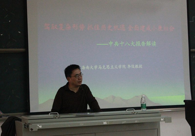 宣讲会上,李俊教授以“驾驭复杂形势 抓住历史机遇 全面建成小康社会”为主题,紧紧围绕十八大精神,从两个“五位一体”构建新的战略布局、科学发展观是党建又一重要成果、社会主义协商民主是政治体制改革的主要内容等八个方面详细阐述。李教授还就十八大精神宣讲与海南国际旅游岛建设、大学精神的深刻内涵进行了深入讲解。李教授幽默生动的演讲不时引来与会人员的阵阵掌声。