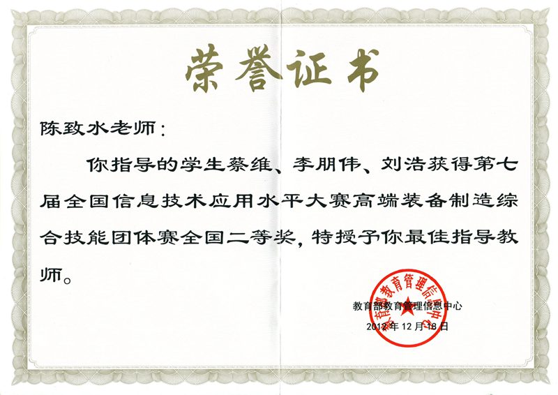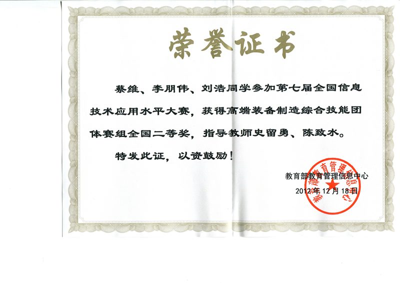 近日,我校永利3044集团师生参加第七届全国信息技术应用水平大赛(高端装备综合制造团体赛)并荣获全国二等奖。该项赛事于2012年5月启动,永利3044集团2010级机械设计制造及其自动化专业蔡维、李朋伟、刘浩等同学组成的团队在老师史留勇、陈致水的指导下,以“全自动椰果脱壳机械装置的设计”为题,在全国初赛1800多份作品中脱颖而出,成功进入了12月16日在北京科技大学举办的全国决赛。在决赛中,经过建模、答辩、作品展示等一系列环节,在强手如林的激烈竞争中最终斩获全国二等奖,史留勇、陈致水荣获“最佳指导教师”称号。颁奖典礼于12月18日在北京大学百年纪念讲堂举行。