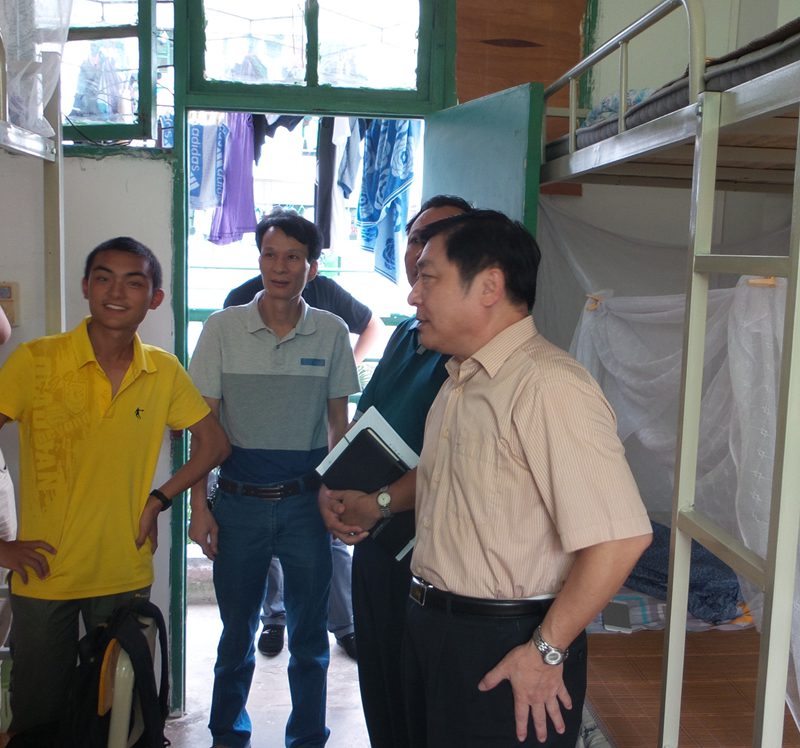 新学期伊始,为了解我院学生的住宿条件和生活状况,给同学们创造一个良好的校园生活环境,为提高学生的社会竞争力奠定一个良好的生活基础。10月15日下午,我校何忠平副校长在后勤管理处邢谷川处长、学院党委黄国标副书记及校办、学院学工办教师们的陪同下专程来到六栋男生宿舍看望学生们。