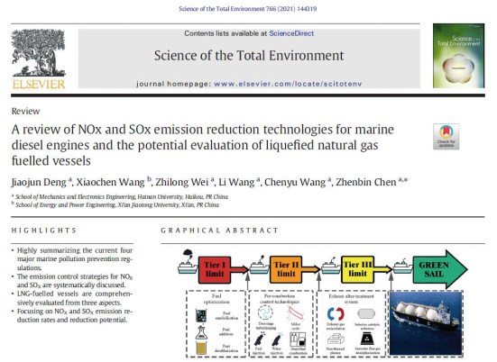 2021年4月20日,Elsevier旗下期刊《Science of the Total Environment》正式出版题为“A review of NOx and SOx emission reduction technologies for marine diesel engines and the potential evaluation of liquefied natural gas fuelled vessels”的综述论文(doi:10.1016/j.scitotenv.2020.144319),该论文以304永利集团为第一单位,2019级机械工程专业硕士生邓交均为第一作者,导师陈振斌教授为通讯作者。《Science of the Total Environment》为SCI源刊,影响因子为6.551,中科院一区top期刊(2020年12月最新升级版)。